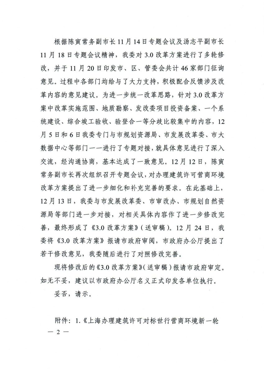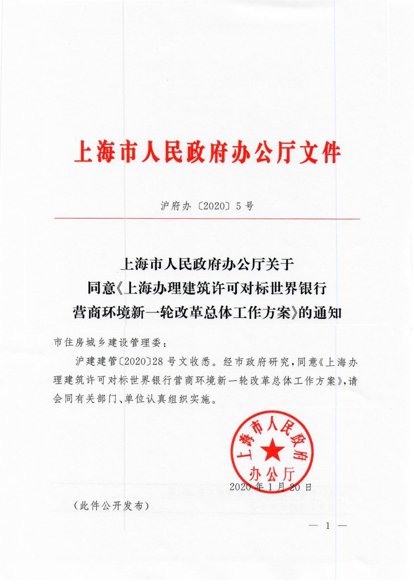 沪府办〔2020〕5号《上海市人民政府办公厅关于同意<上海办理建筑许可对标世界银行营商环境新一轮改革总体工作方案>的通知》