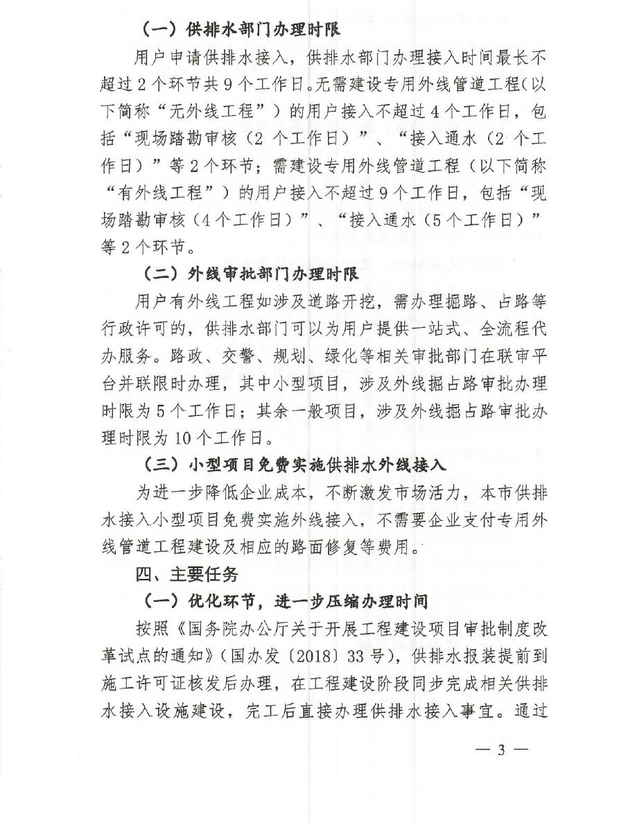 沪建审改〔2019〕3号 《上海市工程建设项目审批制度改革工作领导小组关于印发<进一步优化营商环境深化供排水接入改革的实施方案>的通知》