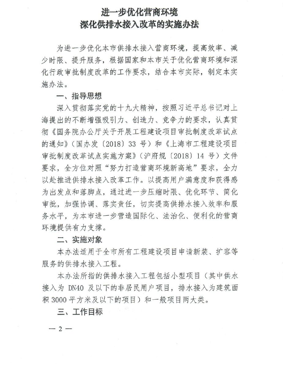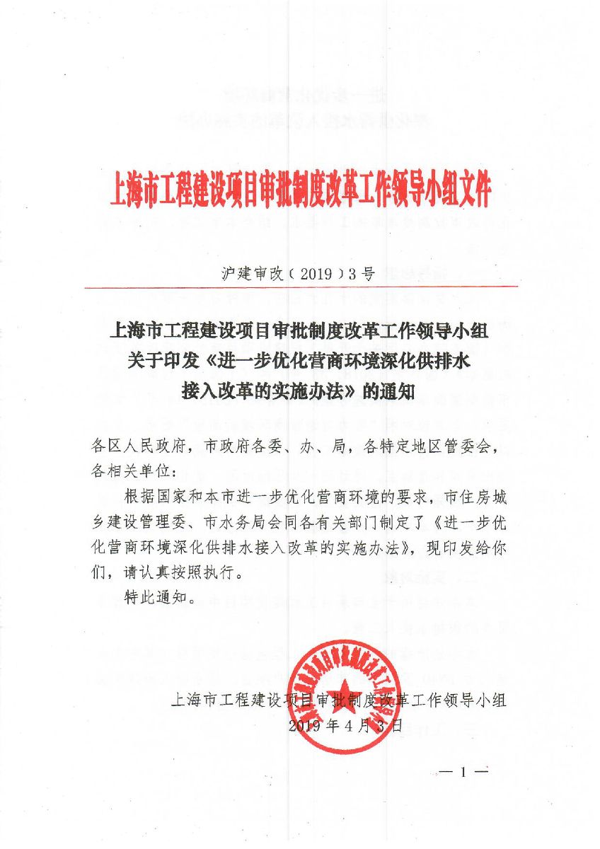 沪建审改〔2019〕3号 《上海市工程建设项目审批制度改革工作领导小组关于印发<进一步优化营商环境深化供排水接入改革的实施方案>的通知》